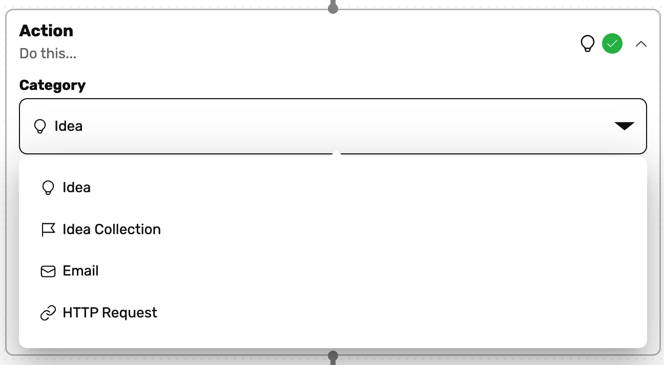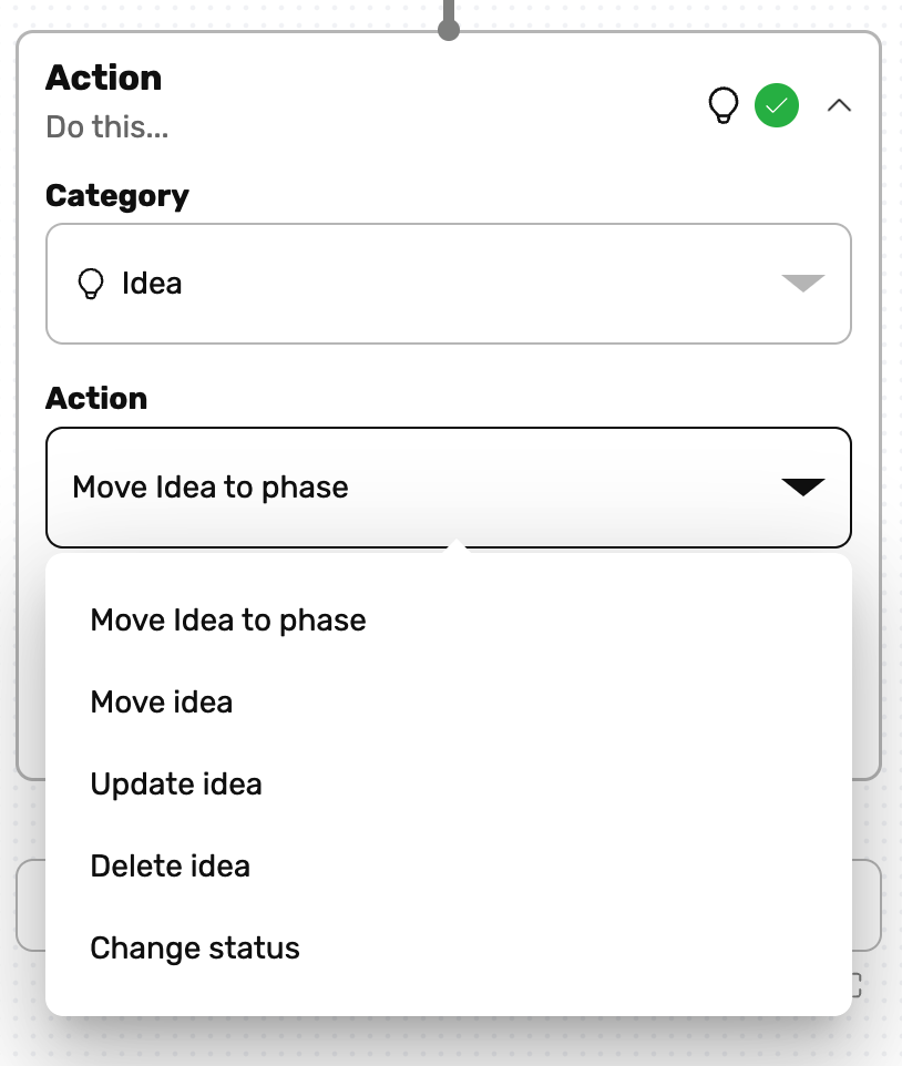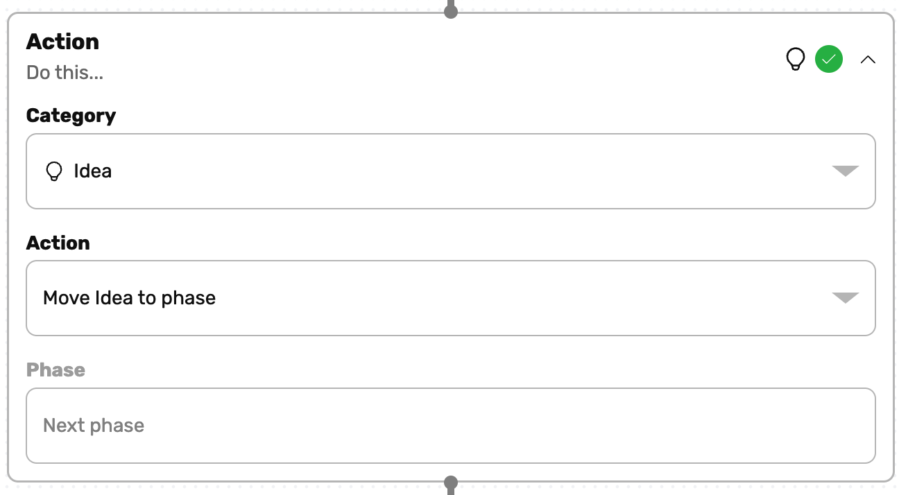 Imagine you wish to propel an idea forward, aligning it with a specific phase of the innovation funnel. When this idea reaches predefined thresholds, aptly named Conditions, the Action will be to "Move idea to Phase ...".