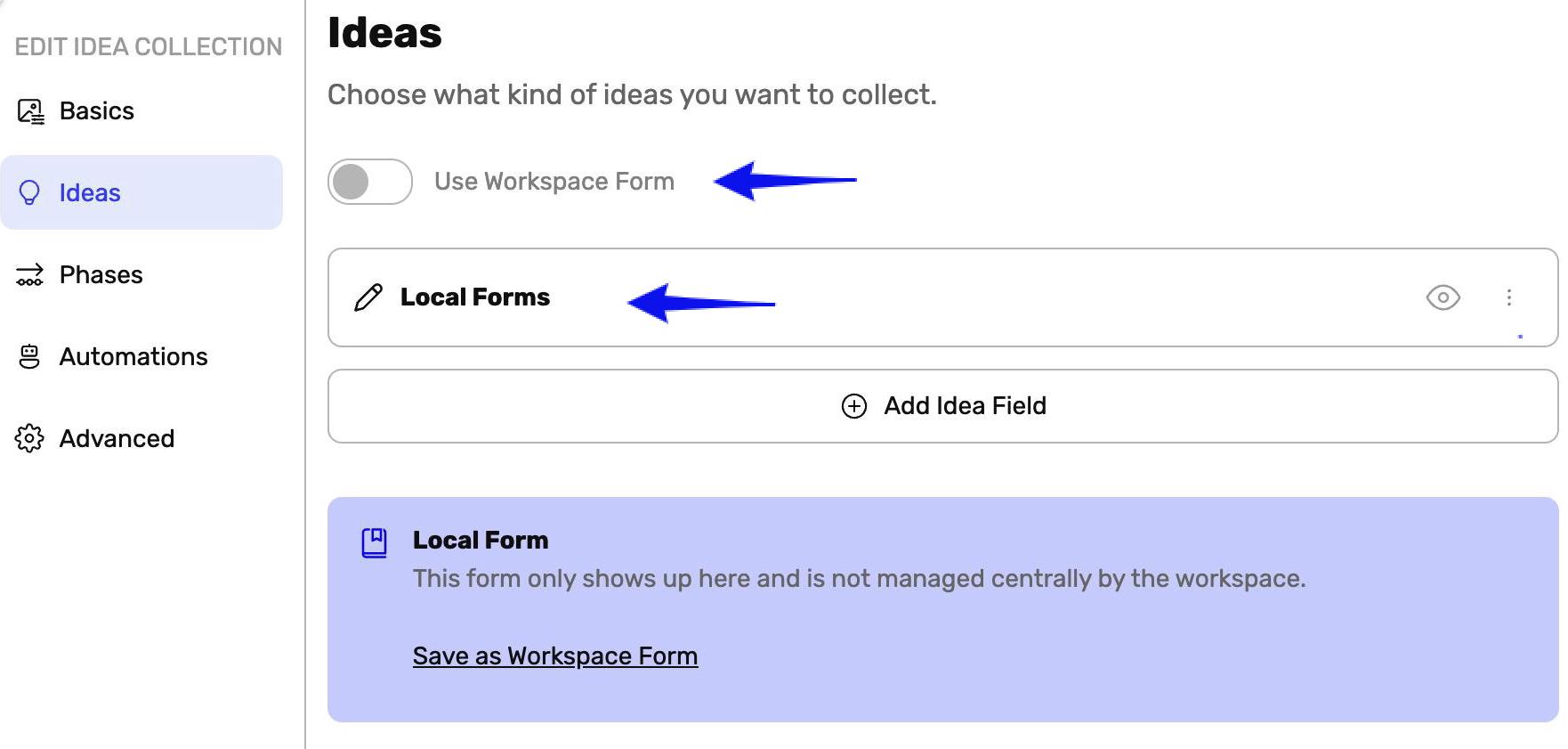 Remarque : Une fois enregistré, le formulaire local s'appliquera uniquement à la collecte d'idées spécifique.
