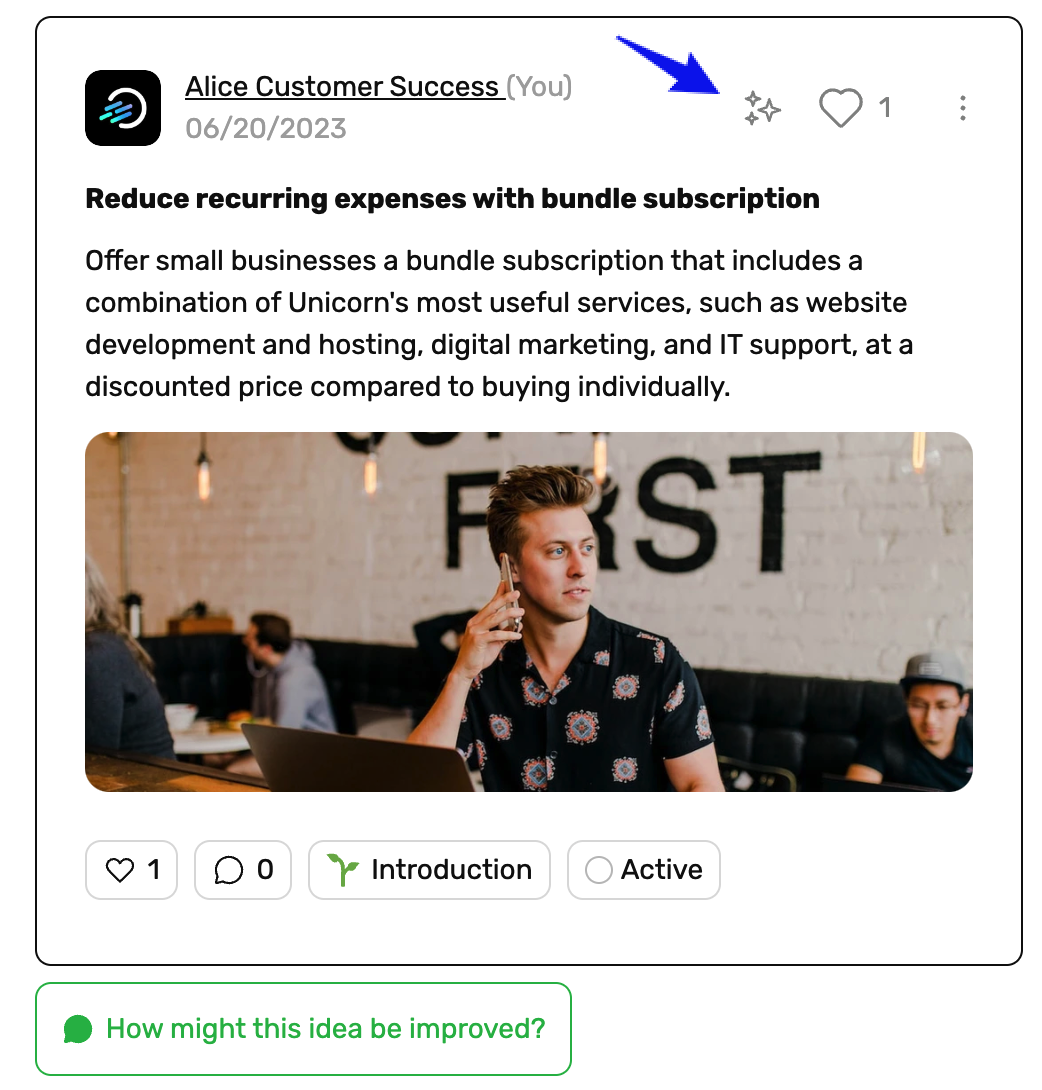 Ideas are created in the name of the person generating an idea but will have an icon showing that they were created at least in part by AI.