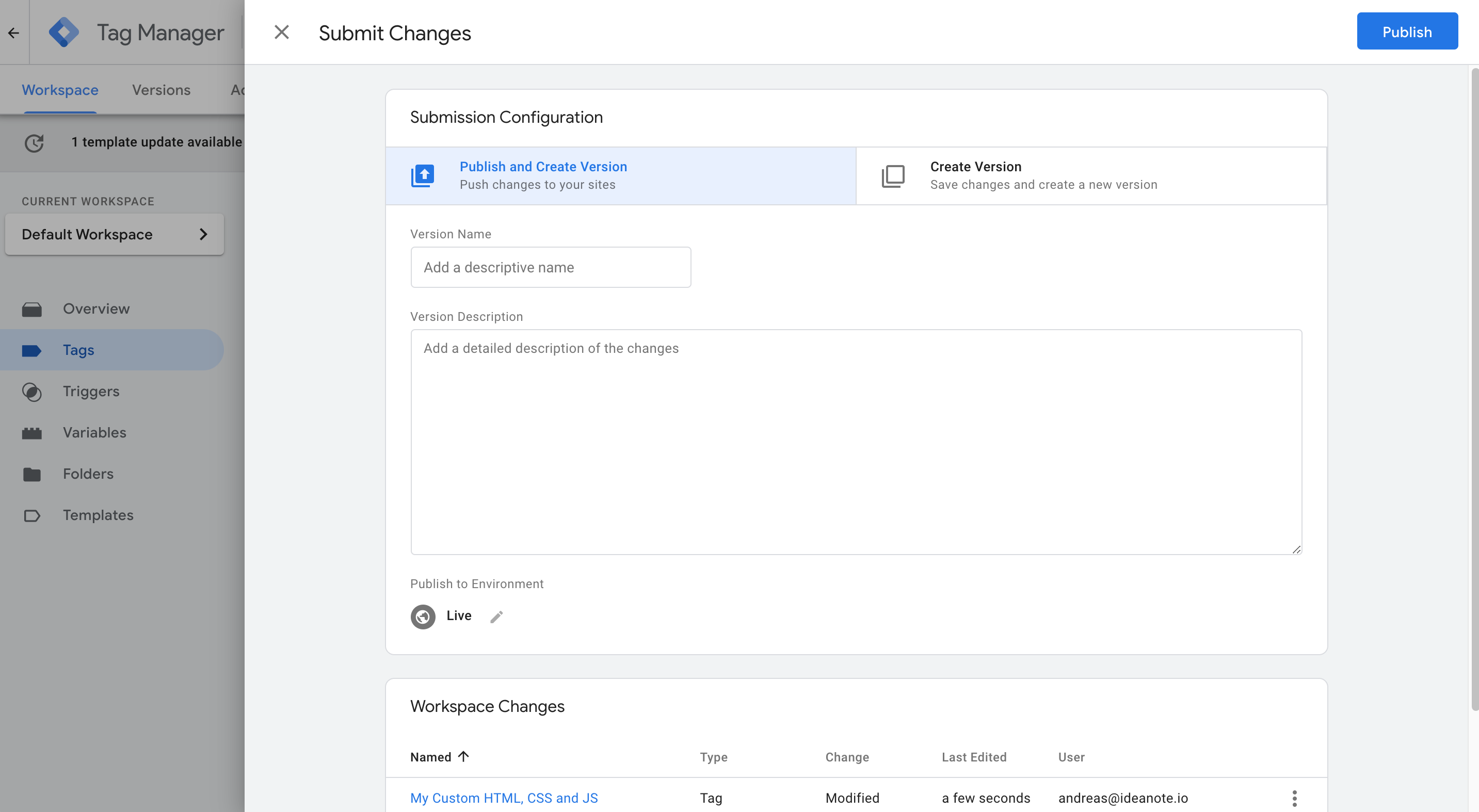 4. Lorsque vous souhaitez publier vos modifications, enregistrez la balise et cliquez sur publier.