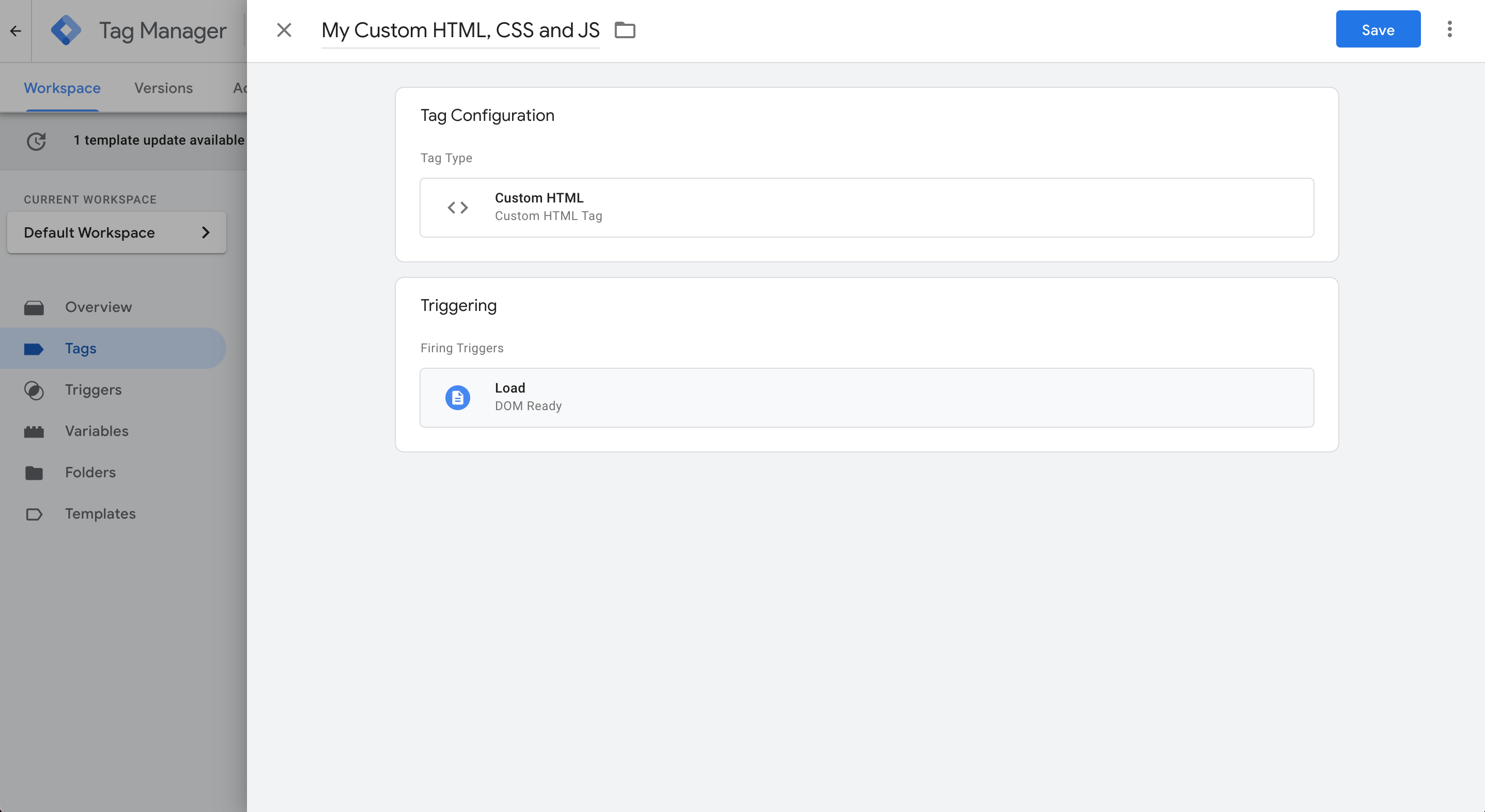 2. Maintenant, vous devez vous rendre sur votre compte Google Tag Manager, cliquer sur Balises et ajouter une nouvelle balise. La configuration de la balise doit être HTML personnalisé et le déclenchement doit être défini sur Chargement.