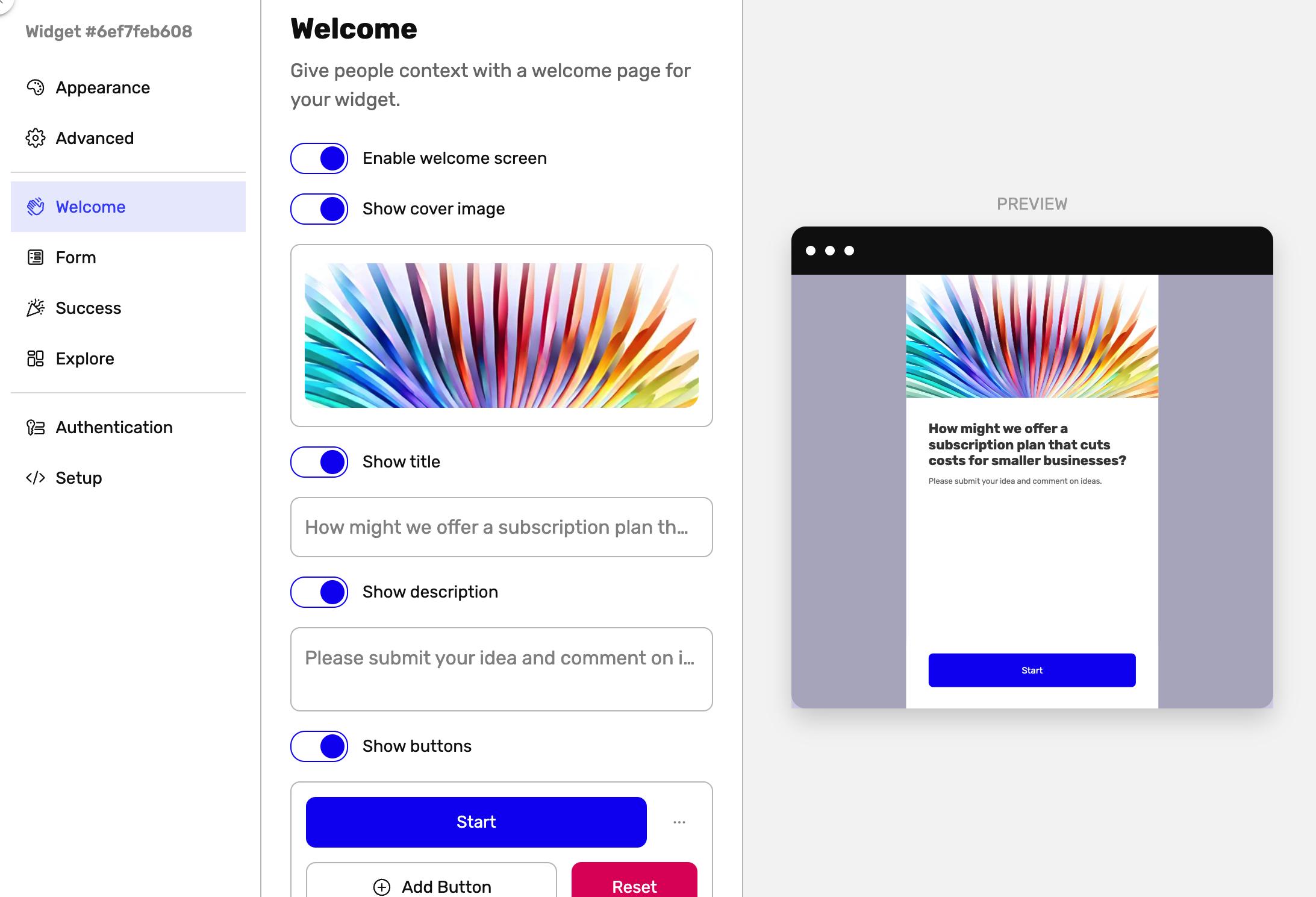 These dynamic Widgets can be embedded on any Website, Webapp, or Mobile app, delivering the same powerful functionalities available on the Ideanote Webapp across multiple channels to reach your audience wherever they are. You can send them out as Full Page Widgets or embed them as Tile or Popover Widgets.