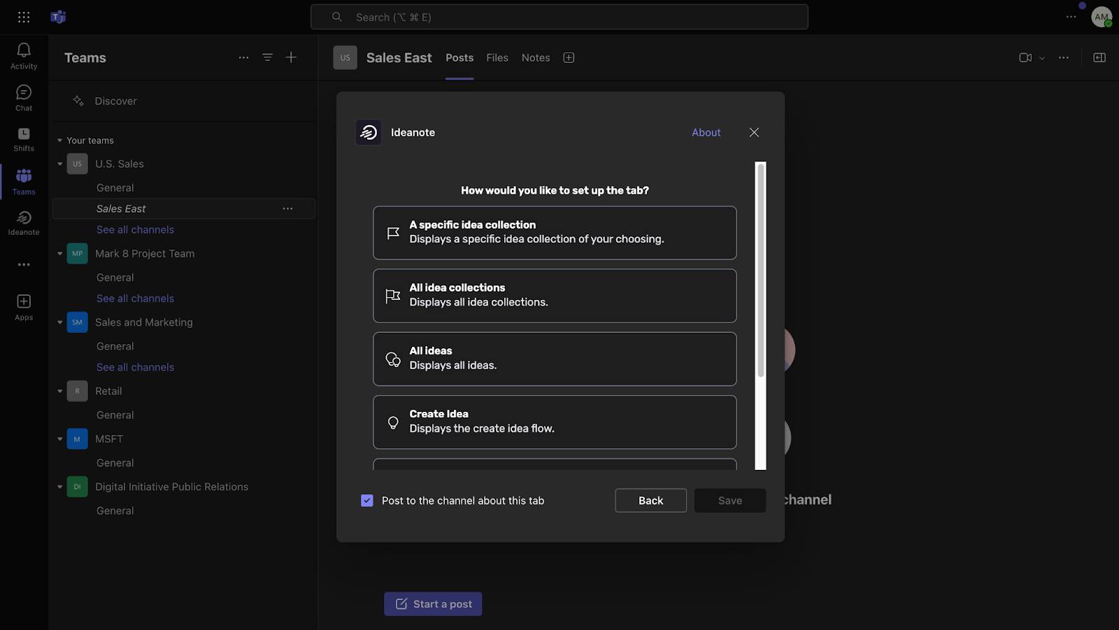 You can now control what page you want to show. Click on the Ideanote subpage you want to show in your channel or team and click the "Save" button.