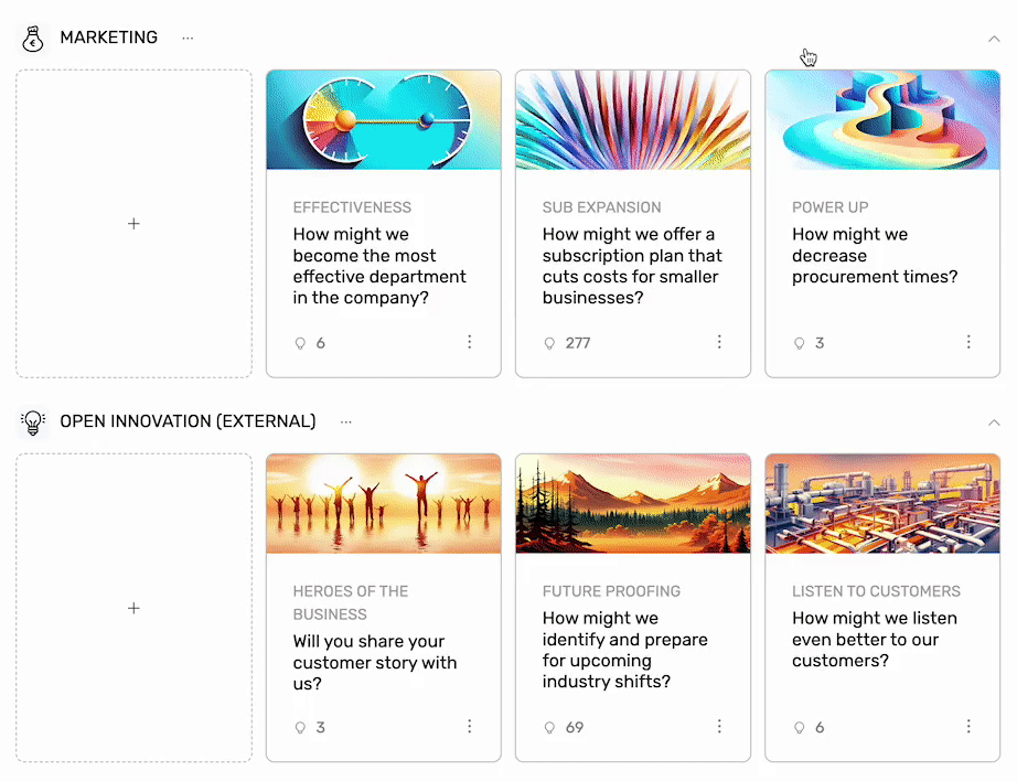 En regroupant les collectes d'idées associées, vous simplifiez la navigation à mesure que vous développez votre innovation au sein de votre entreprise.