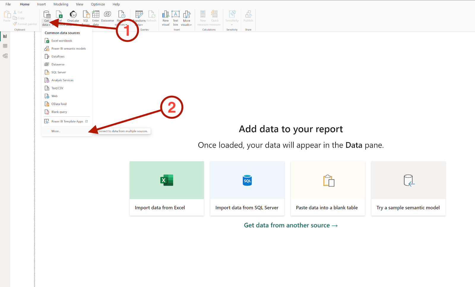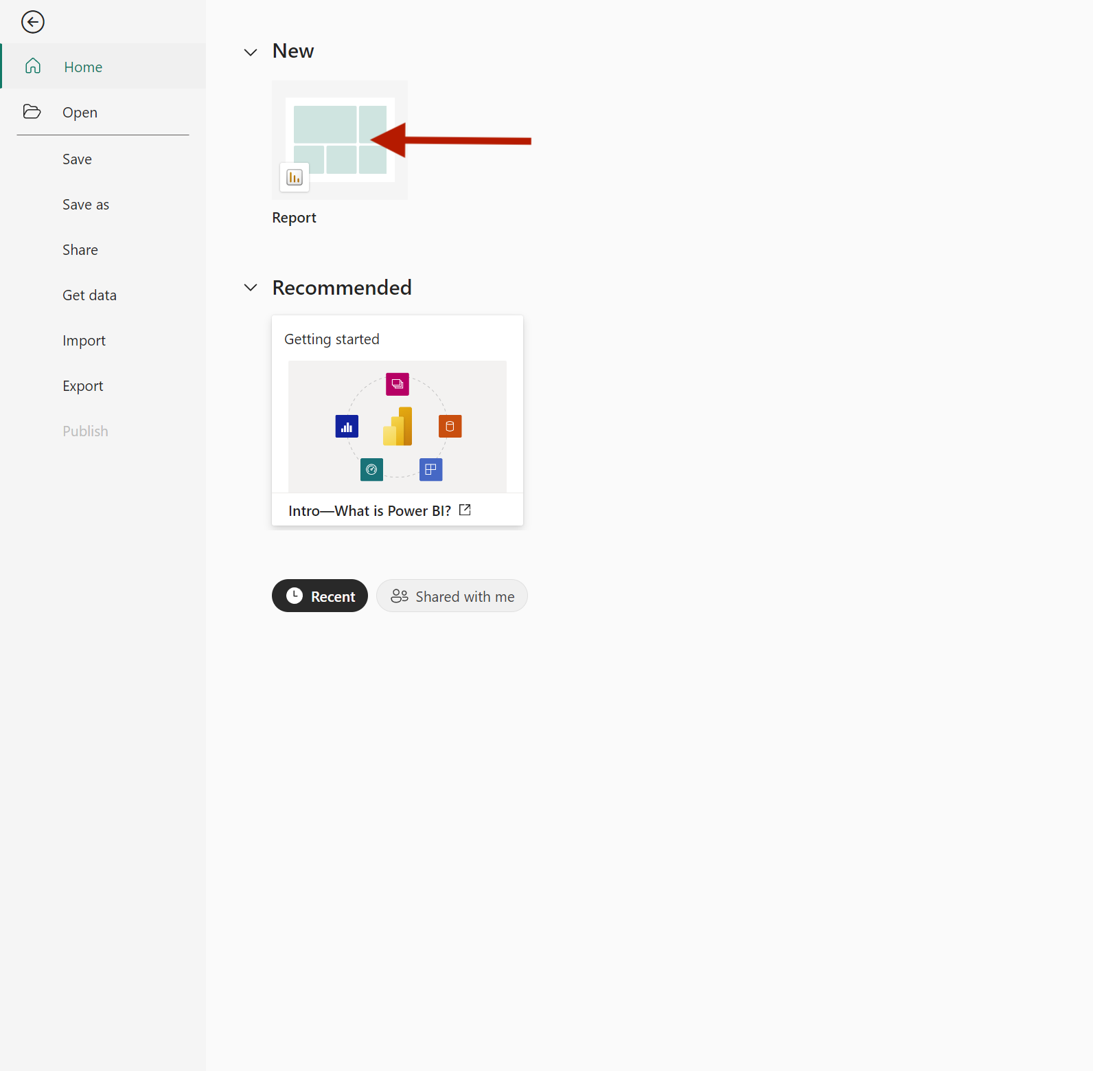 3) Inside PowerBI, open the report you want to connect Ideanote to, or create a new one via the ‘Report’ button under the ‘New’ heading on the ‘Home’ tab