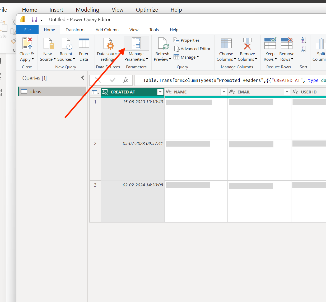 1.2) In the Power Query Editor that opens, Click ‘Manage Parameters’ in the toolbar.