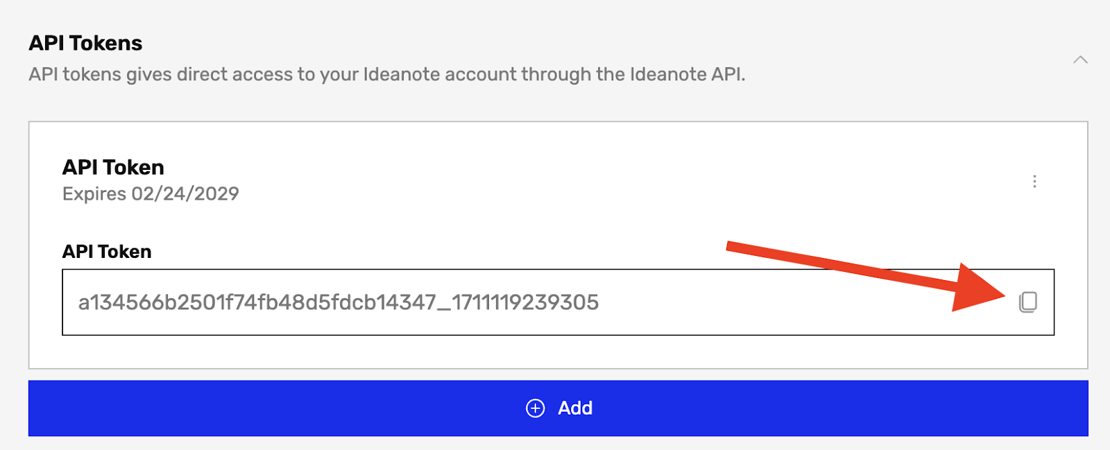 Note: You can also instead use the following direct link, but replace yourworkspace with your actual subdomain: https://yourworkspace.ideanote.io/settings/account#api-tokens
