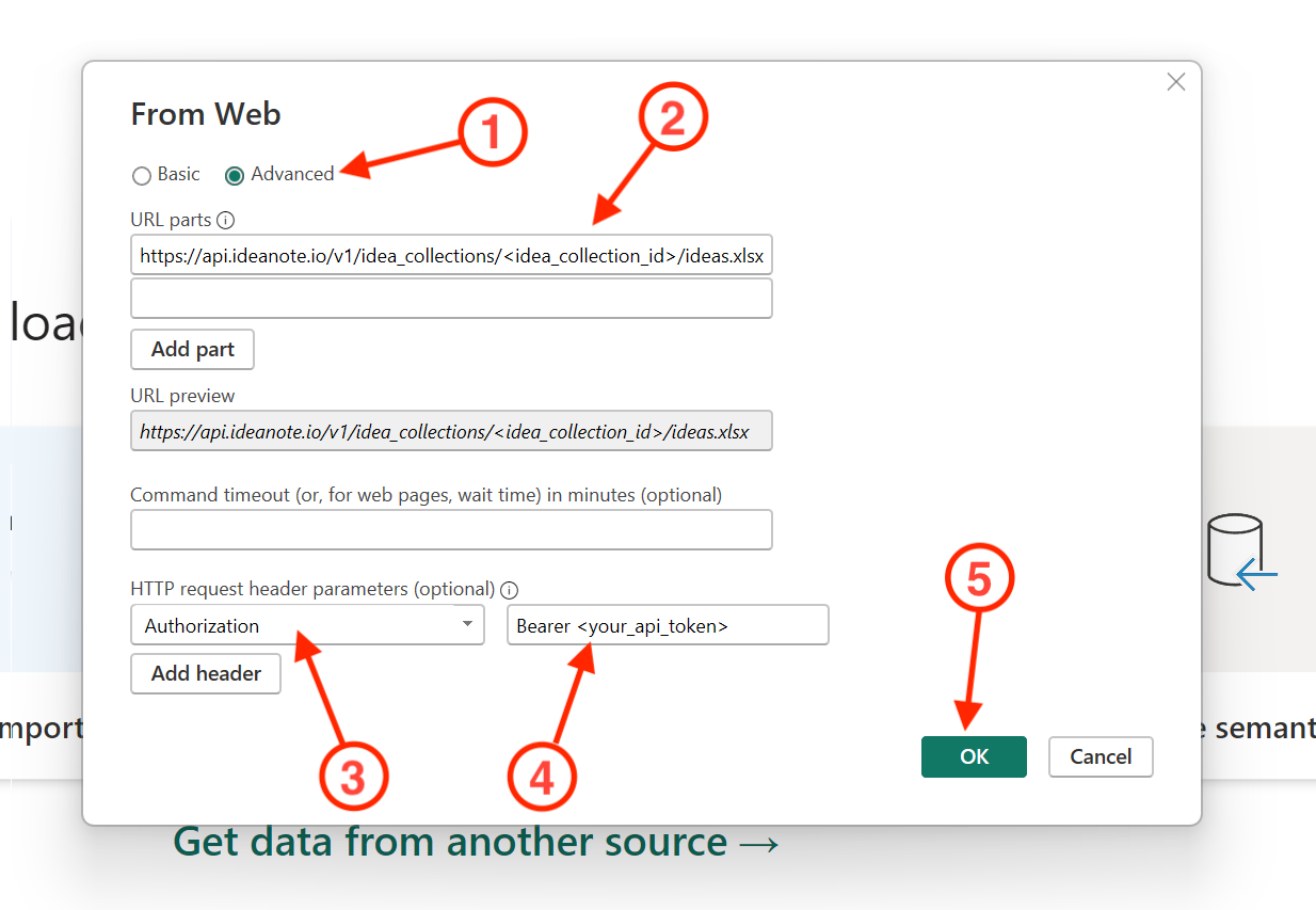 6.2) Under the first ‘URL parts’ text field, insert the URL https://api.ideanote.io/v1/idea_collections/<idea_collection_id>/ideas.xlsx, where the <idea_collection_id> part if replaced by the ID of your idea collection you identified in step (2). For example, if the ID was 28, the full URL would look like this: https://api.ideanote.io/v1/idea_collections/28/ideas.xlsx