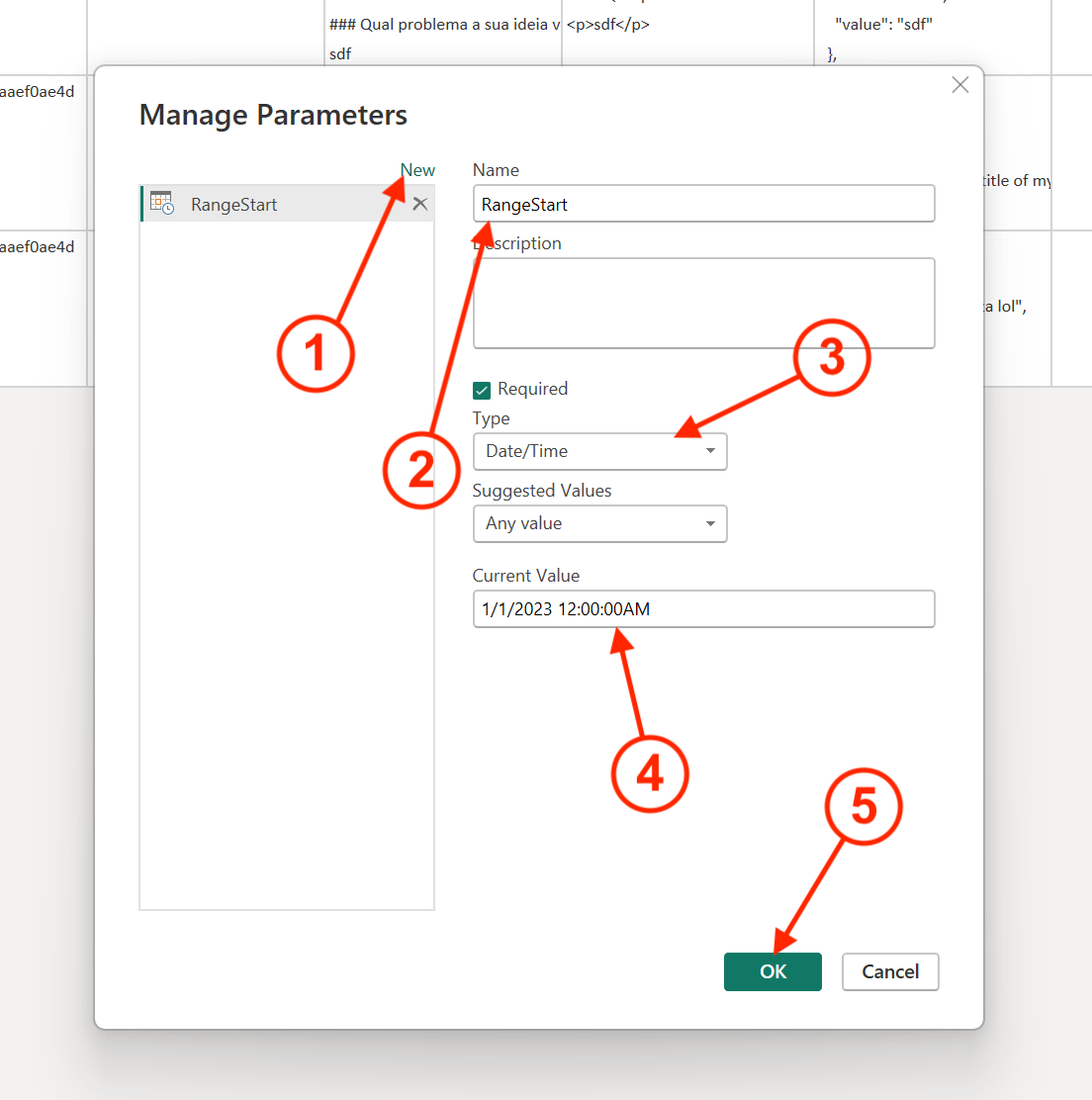 1.7.5) Select ‘RangeStart’ (or whatever you called the parameter) in the dropdown menu next to it (see (4) in the image above).