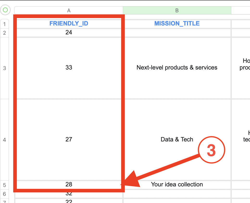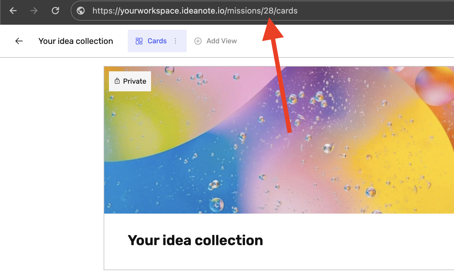 2) You will also need to know the ID of the idea collection to use as a data source. The easiest way to do so is by navigating to the idea collection and extracting the ID from the URL. The ID will be the digits following the /missions/ part of the URL. For example, in the URL https://yourworkspace.ideanote.io/missions/28/cards, 28 will be the ID.