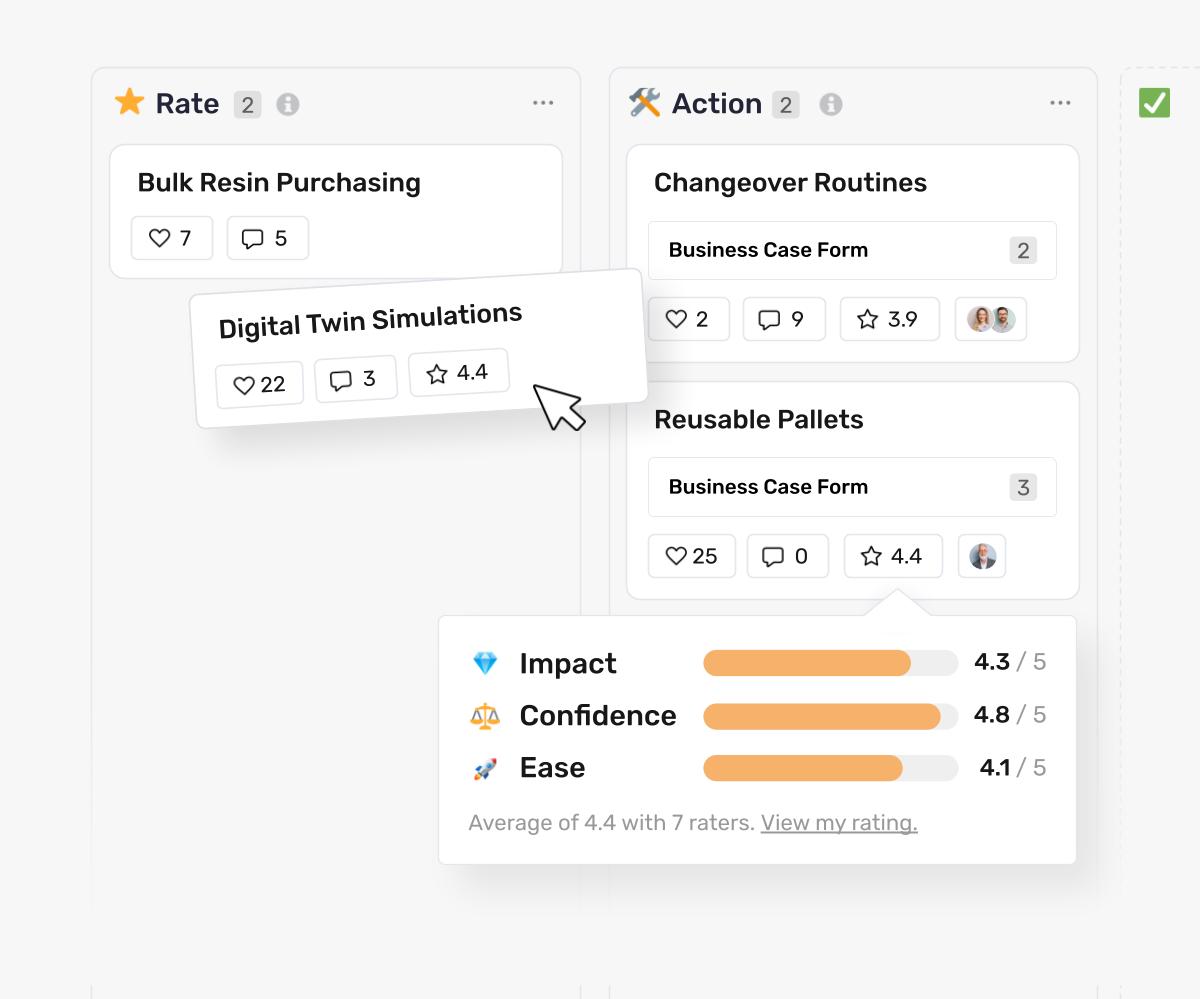 Ideanote soutient l'ensemble du cycle de vie de l'innovation. Exécutez rapidement votre stratégie d'innovation, lancez des collections d'idées en toute confiance et obtenez un impact sur l'innovation.