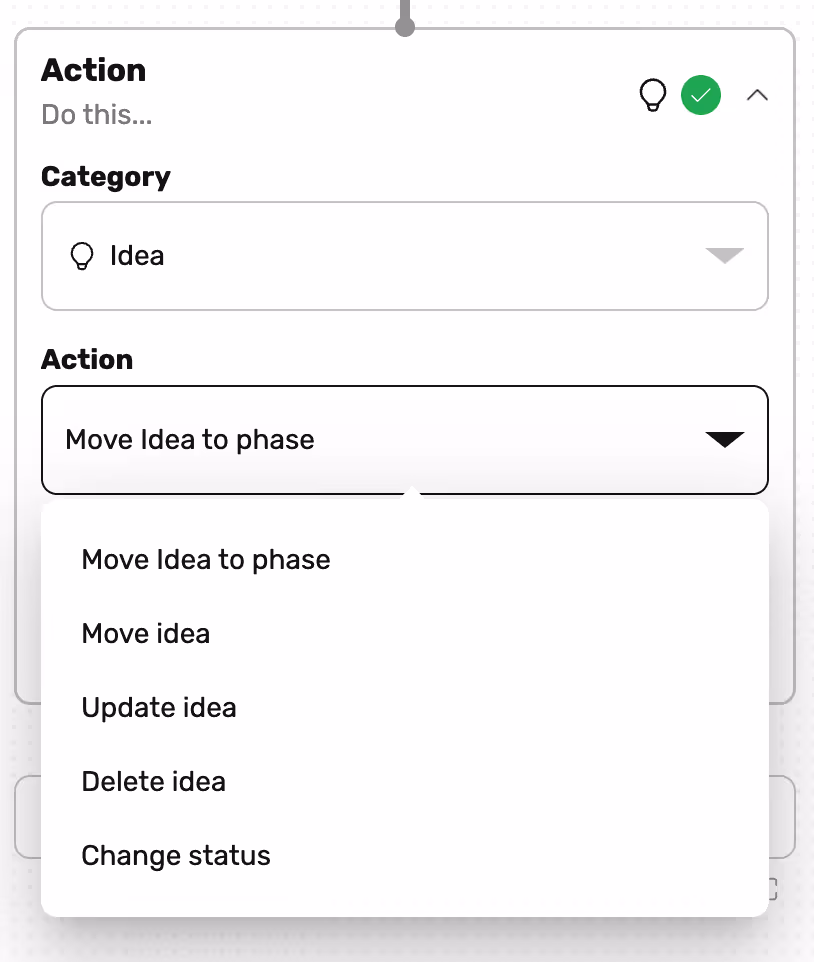Imagine you wish to propel an idea forward, aligning it with a specific phase of the innovation funnel. When this idea reaches predefined thresholds, aptly named Conditions, the Action will be to "Move idea to Phase ...".