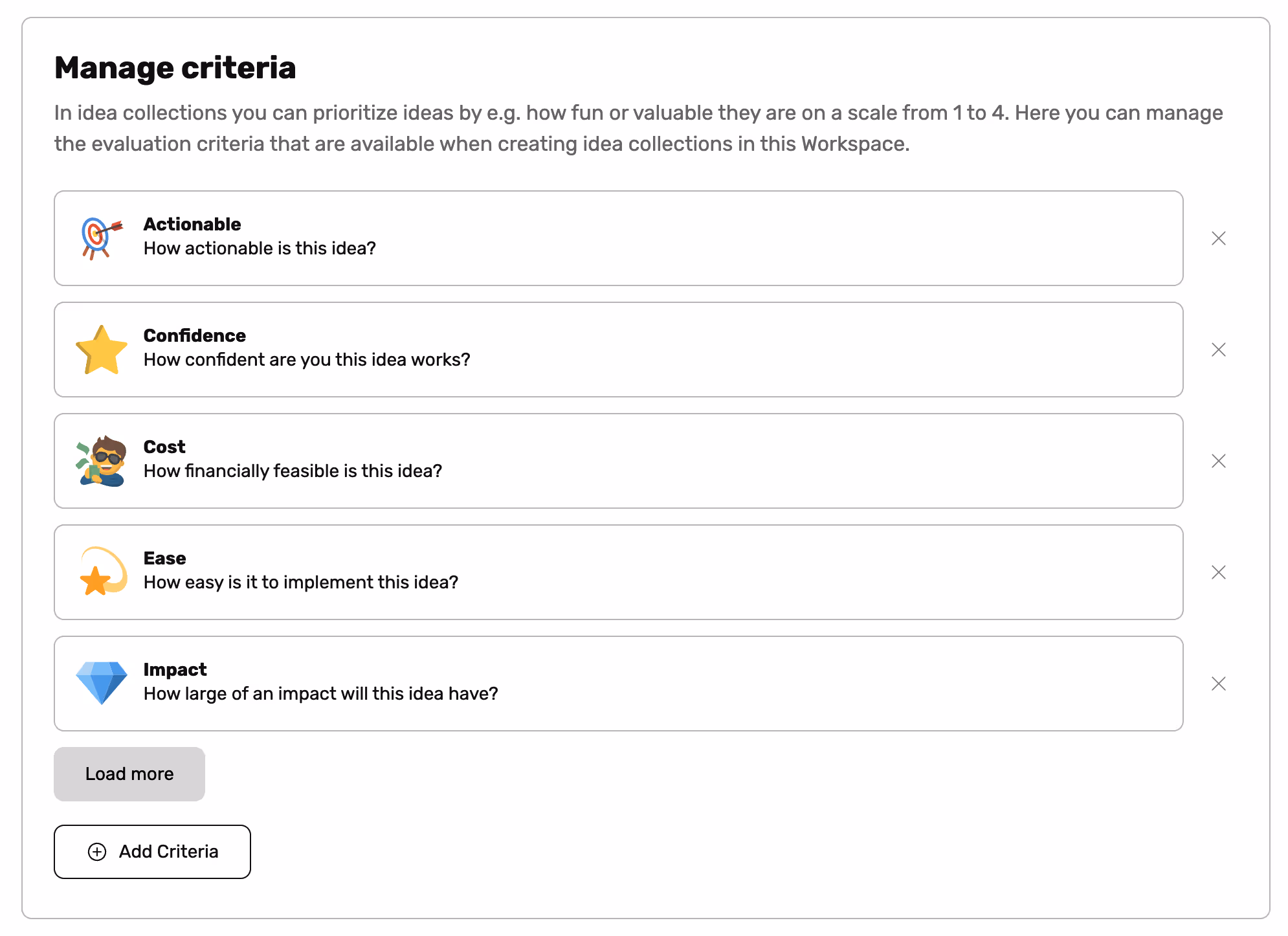 Workspace Owner or Admin Users, can create a standardized evaluation process that spans across all Idea Collections.