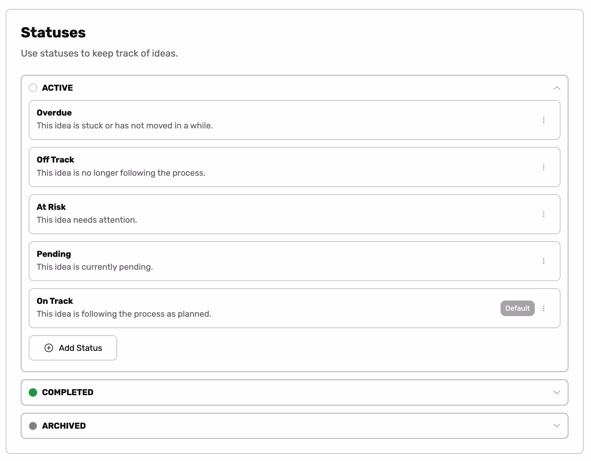 Whether they are Active, Completed, or Archived, you are in full control of each idea's status and can tailor the meaning of each status, aligning them perfectly with your organization's unique processes.